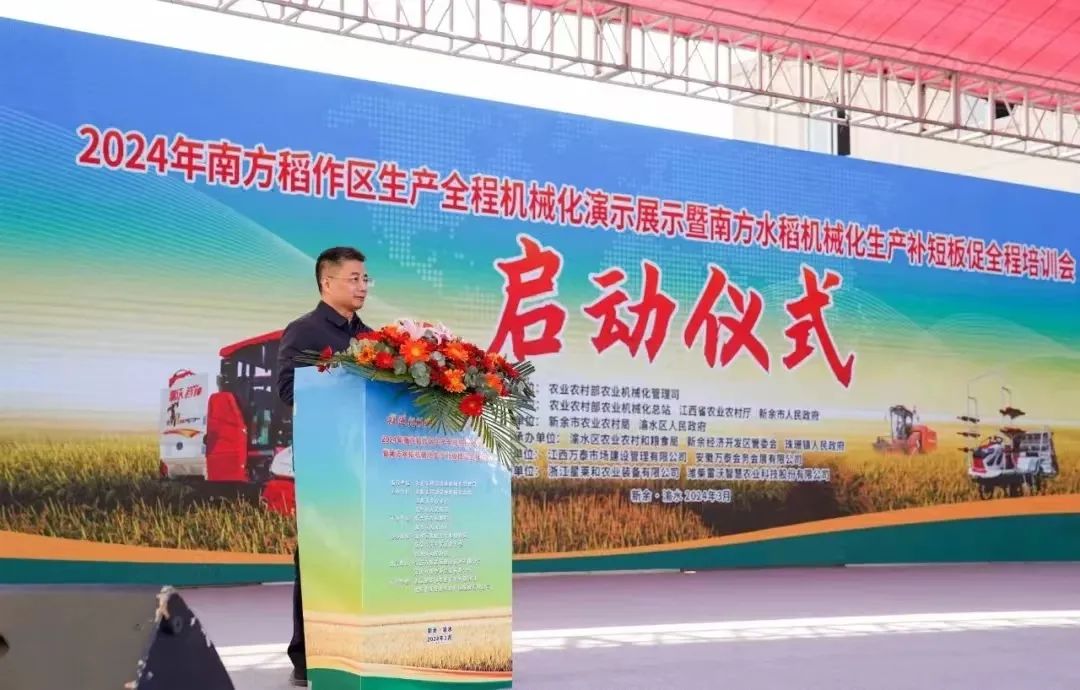 3月22日,由农业农村部农机化总站、江西省农业农村厅、新余市人民政府主办的南方稻作区生产全程机械化演示展示暨南方水稻机械化生产补短板促全程培训活动在新余举行。中国工程院院士罗锡文出席并讲解,农业农村部农机化总站副站长徐振兴,江西省委农办专职副主任、省农业农村厅党组成员兰永清,新余市政府市长徐鸿等领导致辞。江西省农业机械化协会会长吴罗发、副会长邹泰辉、尚小兵、副会长兼秘书长朱仲升、理事彭鹏、监事邹大鹏等组织会员并参加本次活动。