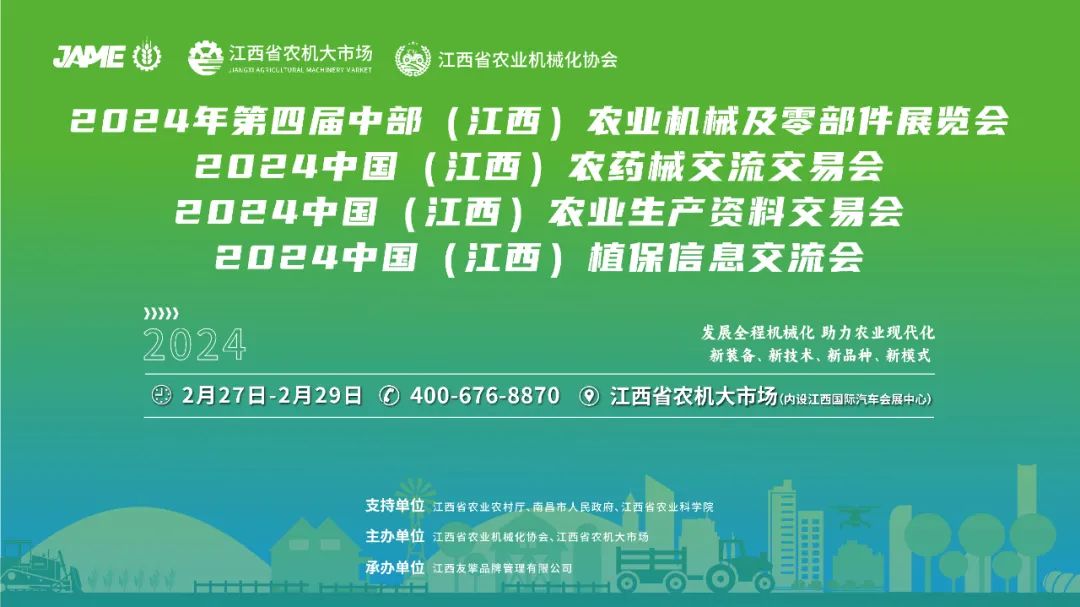 一年好景在春耕,农业盛会来添彩!在江西省农业农村厅、南昌市人民政府、江西省农业科学院的共同支持下,2024年第四届中部(江西)农业机械及零部件展览会(简称第四届江西农机展)将于2024年2月27-29日在江西省农机大市场(内设江西国际汽车会展中心)举办。本届展会由江西省农业机械化协会、江西省农机大市场主办,与2024中国(江西)农药械交流交易会、2024中国(江西)农业生产资料交易会、2024中国(江西)植保信息交流会同期开启,四展融合,覆盖农业生产全域,联袂秀出龙年首场“农业硬实力”。