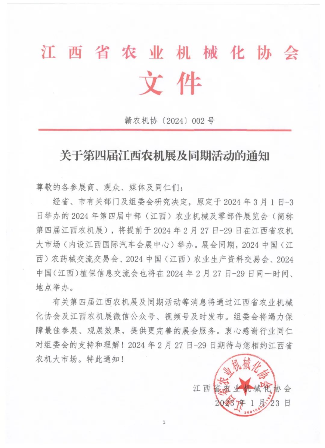 经省、市有关部门及组委会研究决定,原定于2024年3月1日-3日举办的2024年第四届中部(江西)农业机械及零部件展览会(简称第四届江西农机展),将提前于2024年2月27日-29日在江西省农机大市场(内设江西国际汽车会展中心)举办。展会同期,2024中国(江西)农药械交流交易会、2024中国(江西)农业生产资料交易会、2024中国(江西)植保信息交流会也将在2024年2月27日-29日同一时间、地点举办。