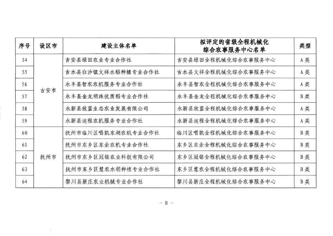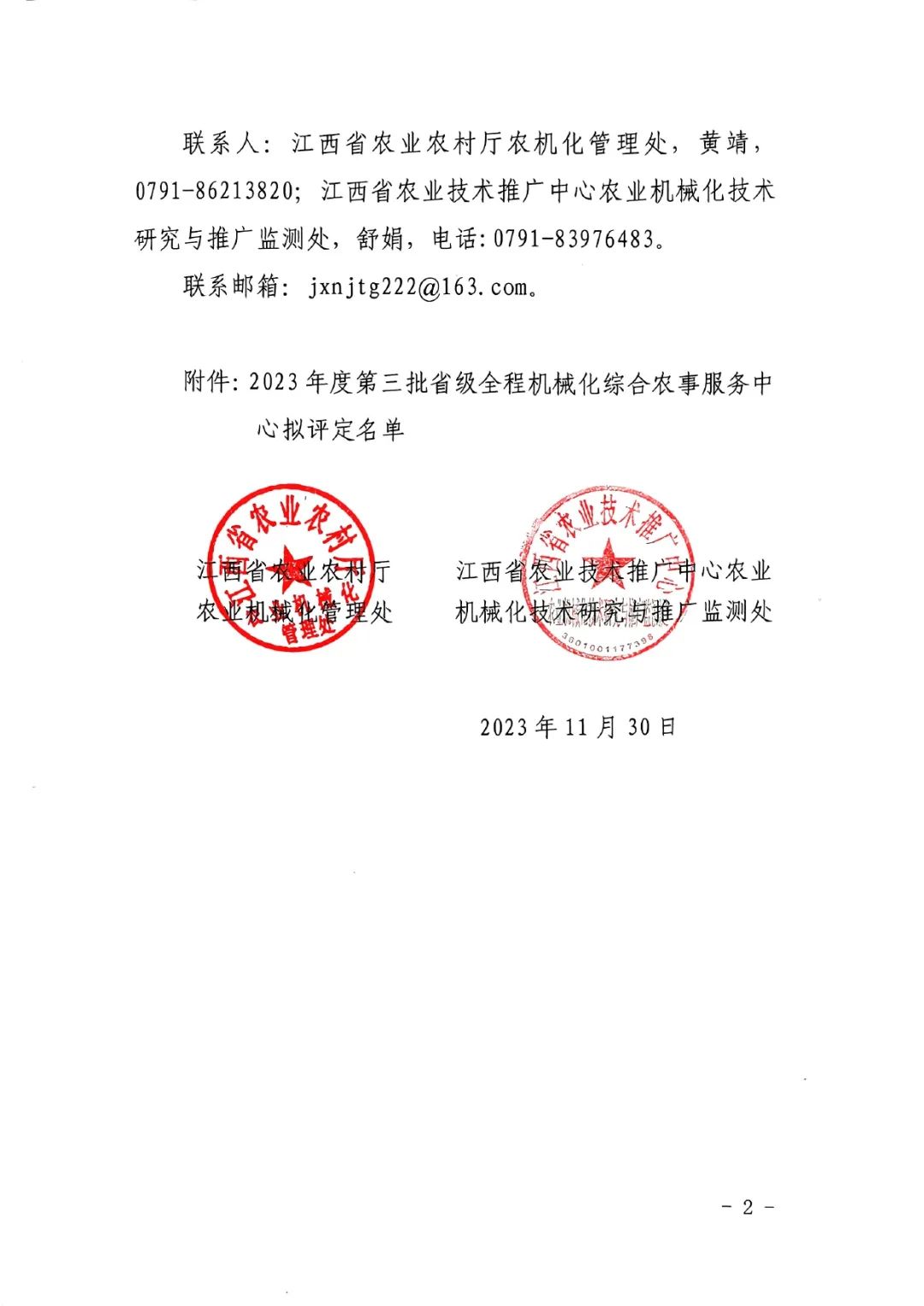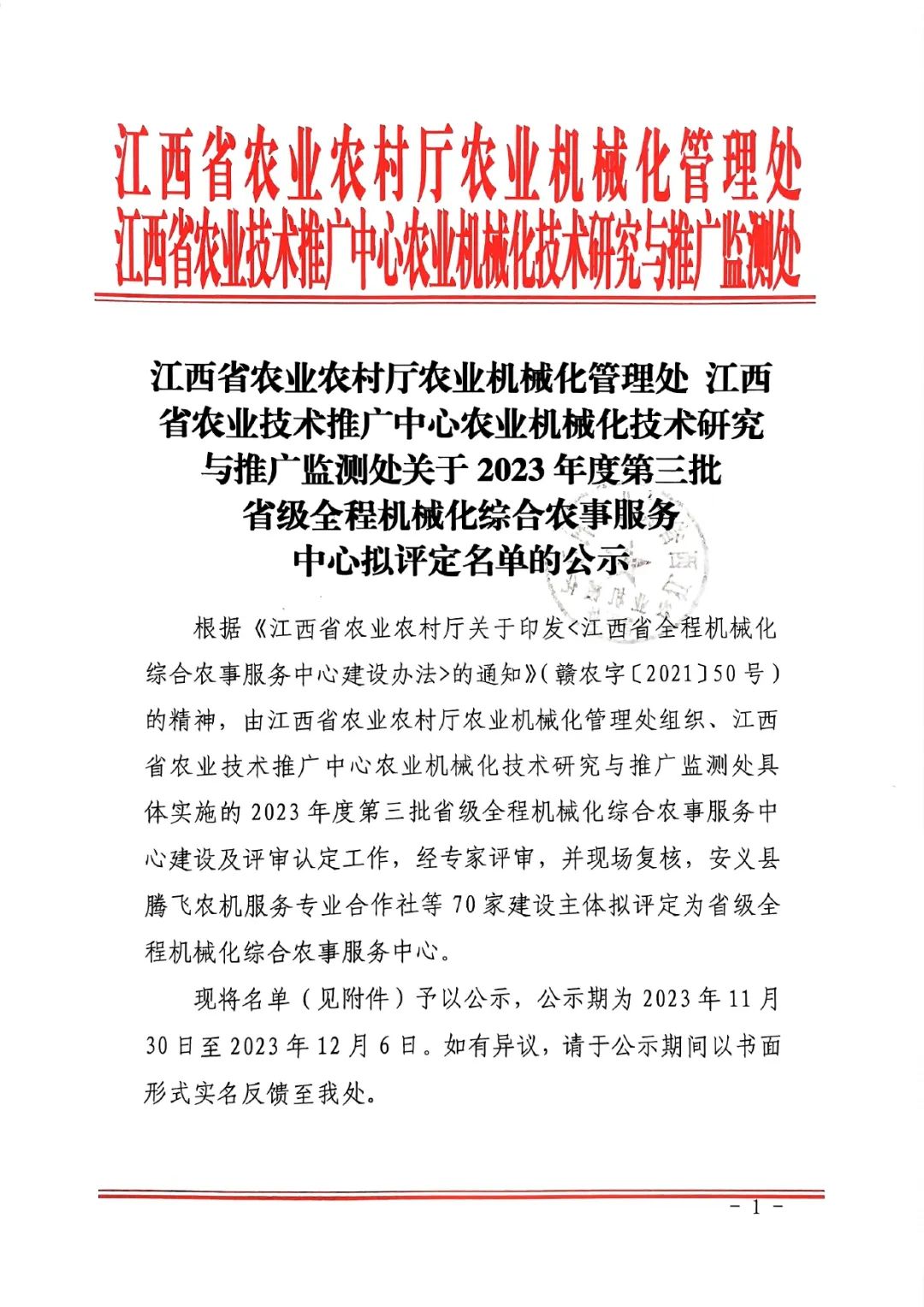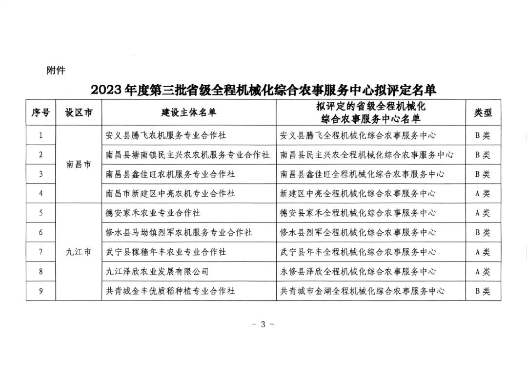 江西省农业农村厅农业机械化管理处 江西省农业技术推广中心农业机械化技术研究与推广监测处关于2023年度第三批省级全程机械化综合农事服务中心拟评定名单的公示