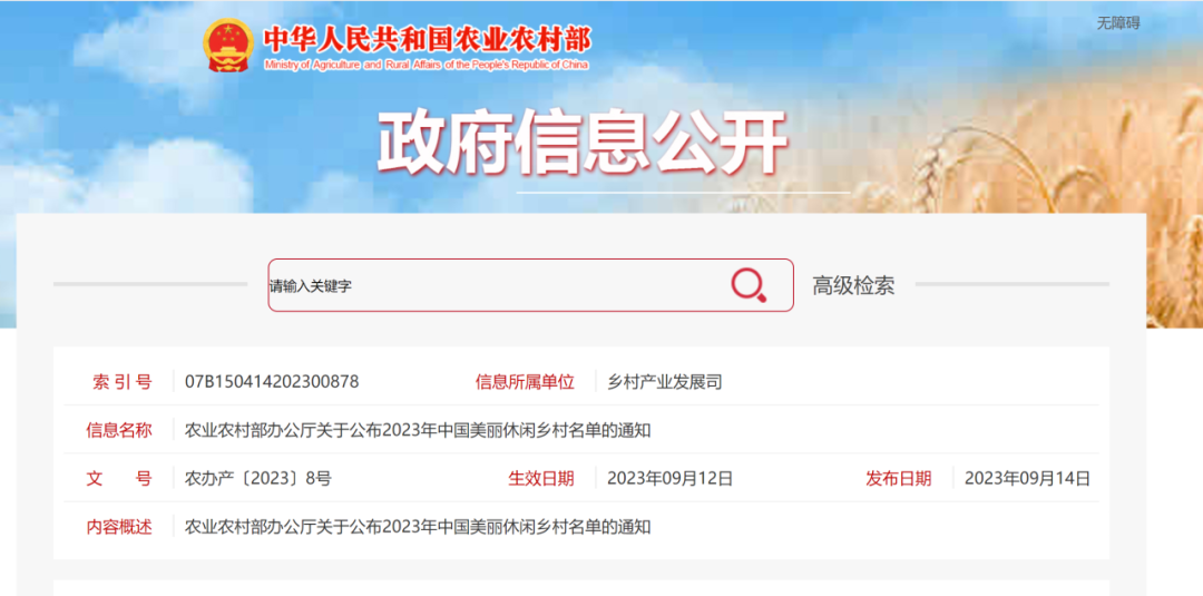 为深入贯彻落实《中共中央、国务院关于做好2023年全面推进乡村振兴重点工作的意见》精神,实施乡村休闲旅游精品工程,我部组织开展了2023年中国美丽休闲乡村申报工作。经各地推荐、专家评审和网上公示,推介北京市房山区张坊镇大峪沟村等256个村落为2023年中国美丽休闲乡村,其中北京市怀柔区怀北镇河防口村等79个乡村同时为农家乐特色村。