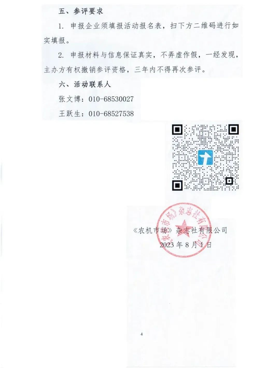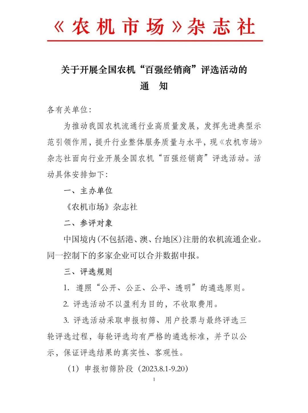 为推动我国农机流通行业高质量发展,发挥先进典型示范引领作用,提升行业整体服务质量与水平,由中国农业机械流通协会主办的《农机市场》杂志社现面向行业开展全国农机“百强经销商”评选活动。