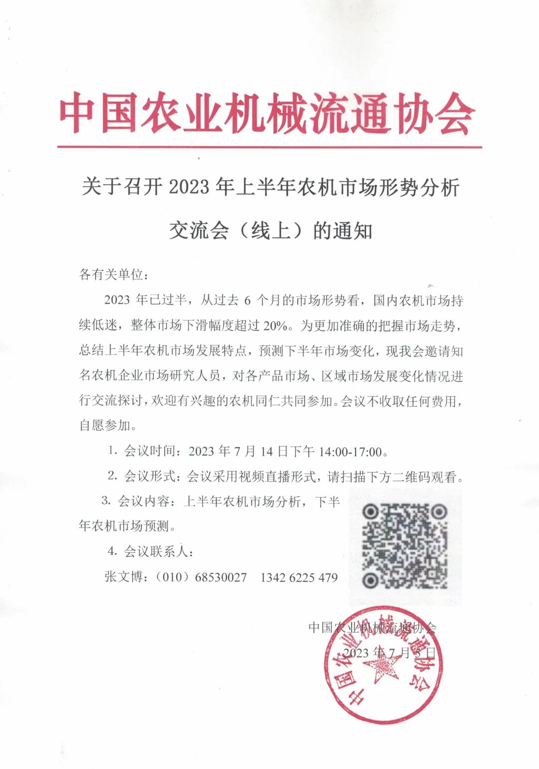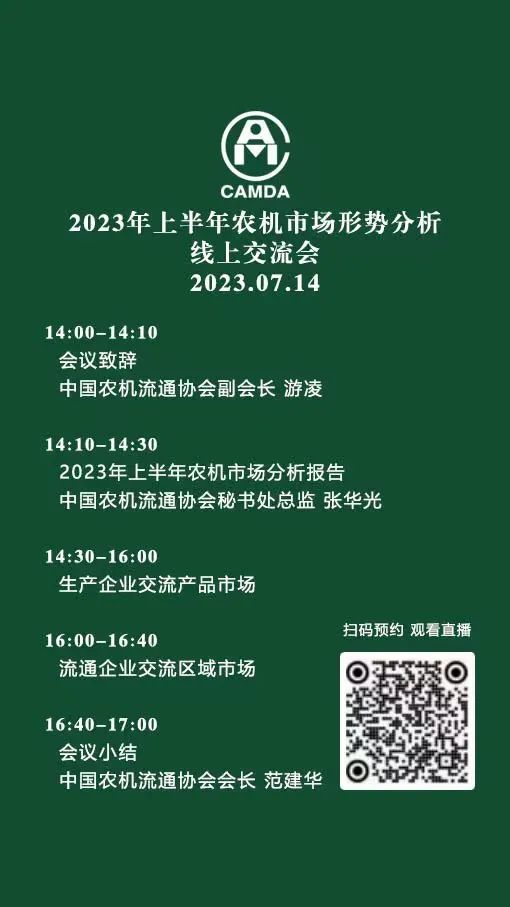2023年已过半,从过去6个月的市场形势看,国内农机市场持续低迷,整体市场下滑幅度超过20%。为更加准确的把握市场走势,总结上半年农机市场发展特点,预测下半年市场变化,现我会邀请知名农机企业市场研究人员,对各产品市场、区域市场发展变化情况进行交流探讨,欢迎有兴趣的农机同仁共同参加。会议不收取任何费用,自愿参加。