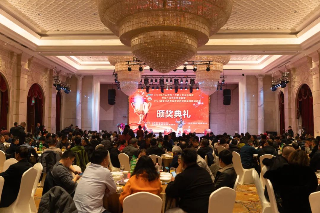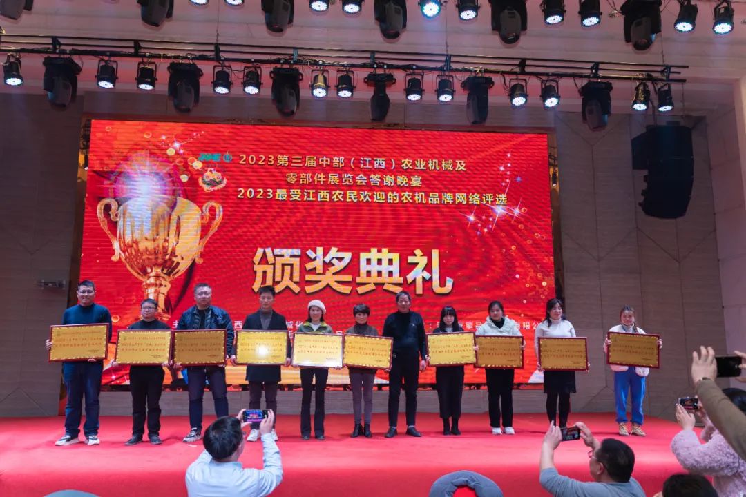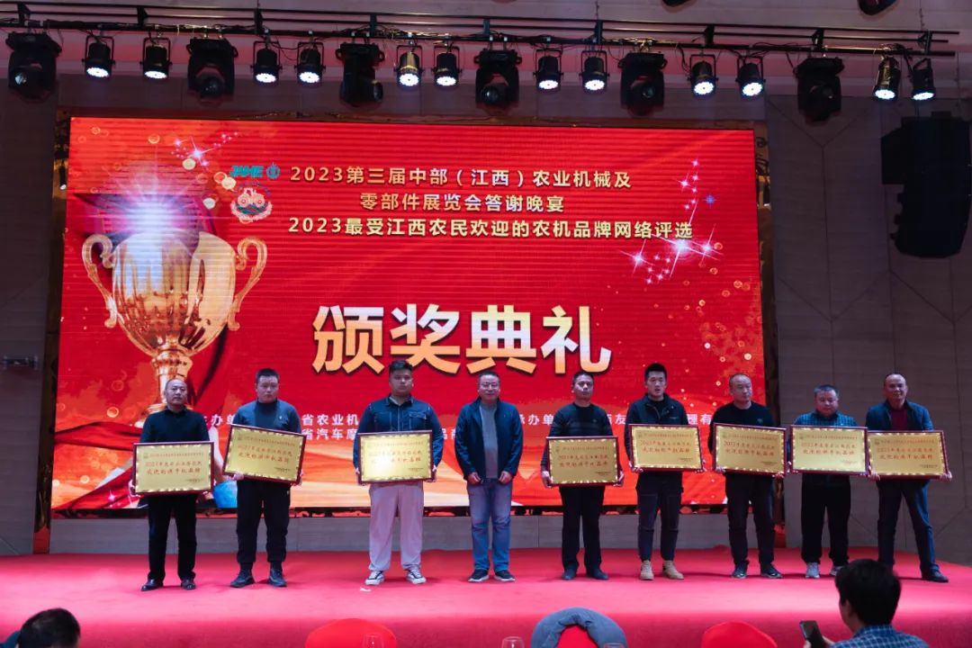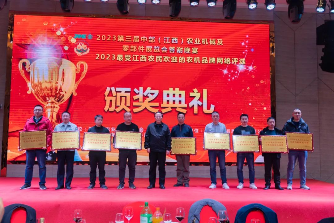 25日晚,由江西省农业机械化协会、江西省汽车摩托车配件用品商会主办,江西友擎品牌管理有限公司承办的2023年第三届中部(江西)农业机械及零部件展览会答谢晚宴暨2023最受江西农民欢迎的农机品牌网络评选颁奖典礼隆重举行。中国农业机械流通协会会长范建华、中国农业机械化协会会长刘宪,江西省农业机械化协会会长吴罗发,协会副会长、第三届江西农机展会务组负责人朱仲升,副会长、南昌县蒋巷镇大田农社总经理邹泰晖,协会监事邹大鹏,江西省农业机械化协会流通分会执行会长尚小兵、江西省汽车摩托车配件用品商会轮值会长石国宁,监事长李世财、副会长辛至龙、江洁印、熊兵兵、李慎彪、张亮亮等出席本次活动,并为获奖企业颁奖。