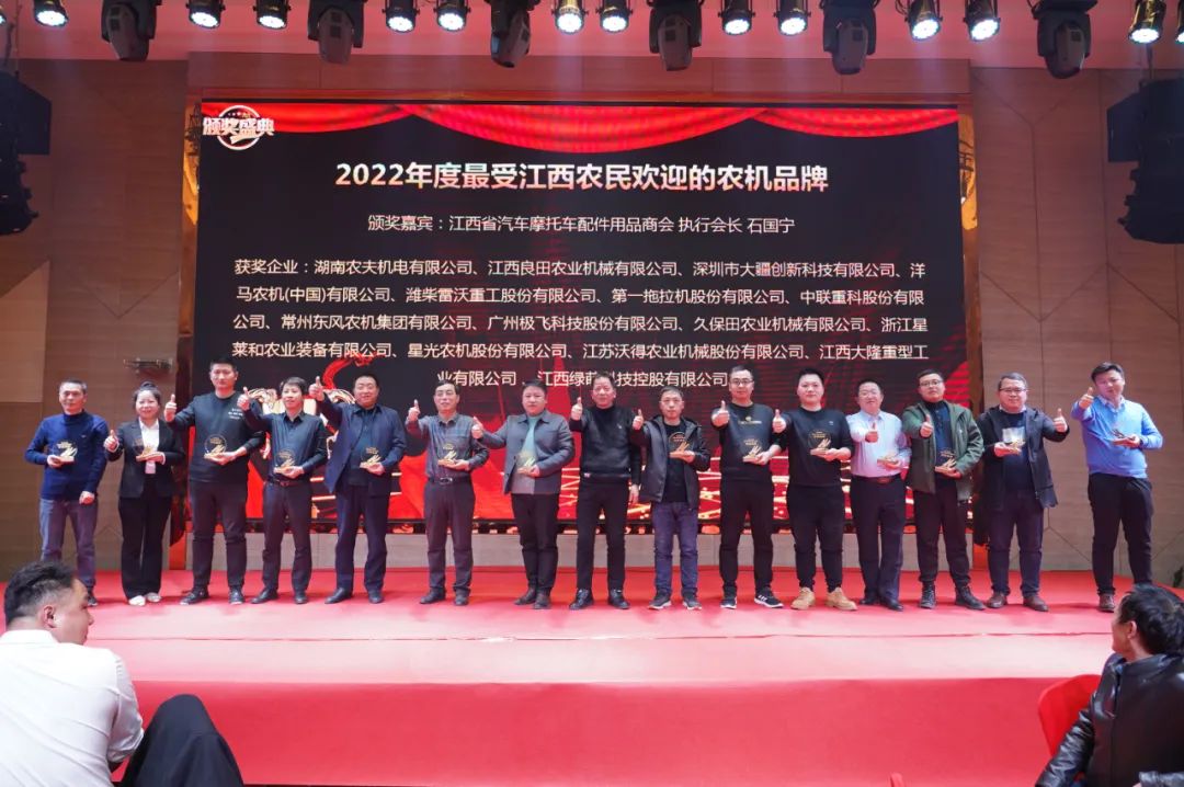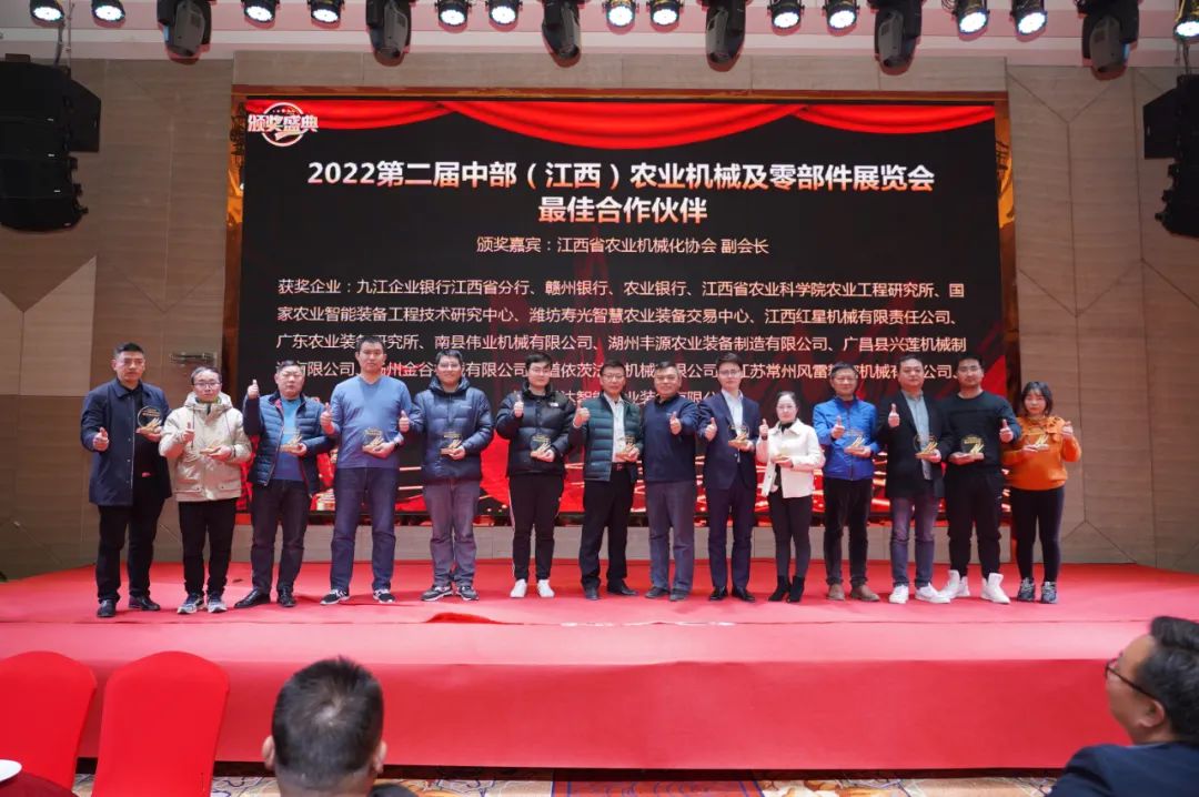 2022年2月27日,2022第二届中部(江西)农业机械及零部件展览会的晚宴现场,举行了2022最受江西农民欢迎的农机品牌网络评选颁奖典礼,经过网络评选、专家评审并征求社会意见,评选出了2022第二届中部(江西)农业机械及零部件展览会最佳合作伙伴奖和2022年度最受江西农民欢迎的农机品牌奖。
