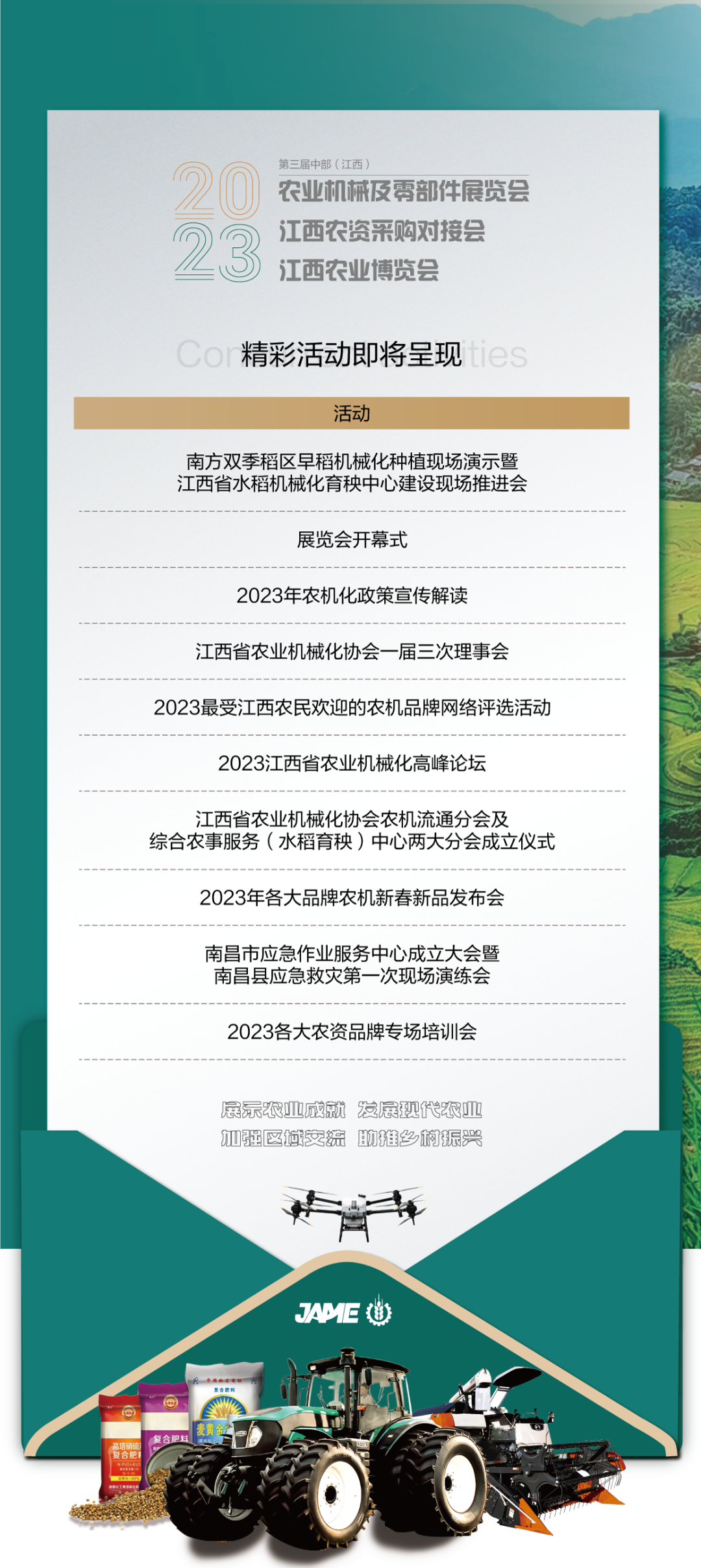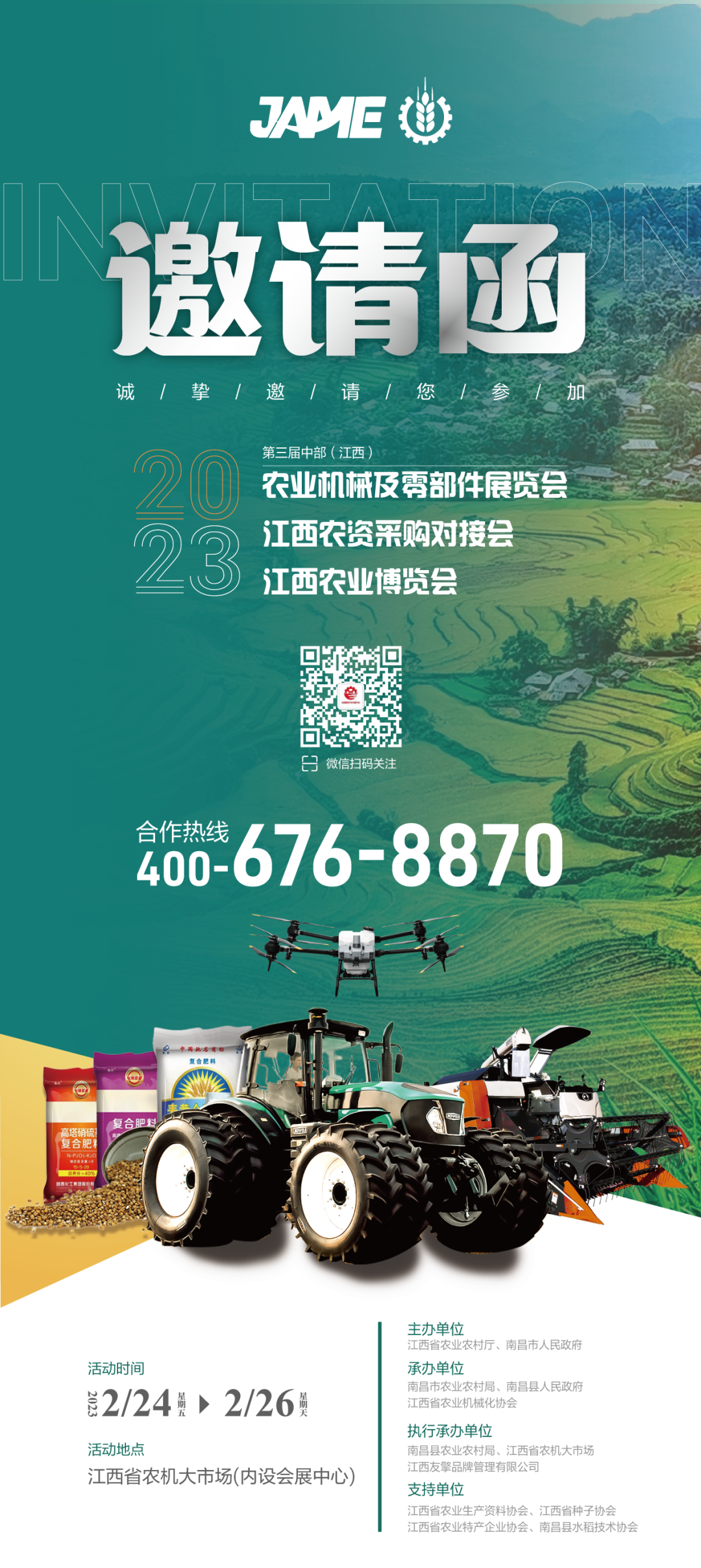 为助力江西农业机械化的发展进程,表彰行业中受到广大农民欢迎和满意的农业机械及零部件相关产品品牌,江西省农业机械化协会拟在江西省农业农村厅、南昌市人民政府的指导下,联合第三届中部(江西)农业机械及零部件展览会组委会、江西省农机大市场等主承办单位,于2023年2月24日在江西省农机大市场(内设会展中心),举行2023最受江西农民欢迎的农机品牌网络评选颁奖仪式。现将活动有关事项说明如下: