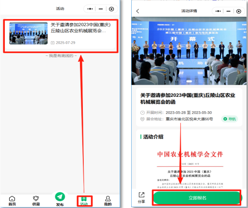 选择小程序“活动”模块,可查看协会活动,点击“立即报名”,并提交报名信息。提交报名后,由秘书处审核报名信息,通过后即可报名成功。