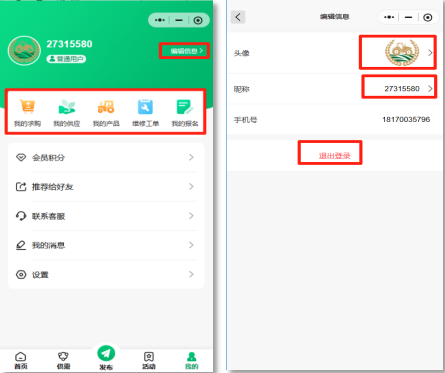 选择小程序“我的”模块,最上方可进行账号信息编辑。选择中间栏,可查看我的求购、我的供应、我的产品、维修工单、我的报名等信息