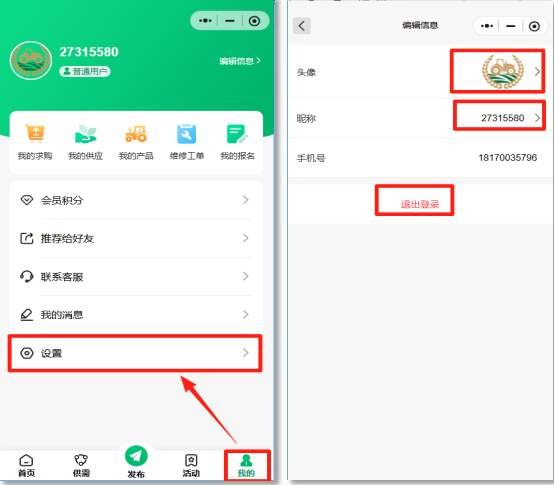 选择小程序“我的”模块,点“设置”可进行账号信息编辑,账号退出登操作