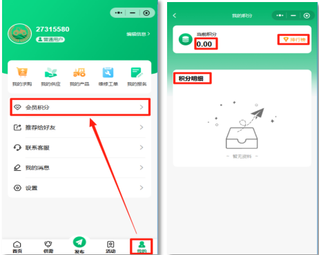 选择小程序“我的”模块,点“会员积分”,可查看积分、积分明细,积分排行榜