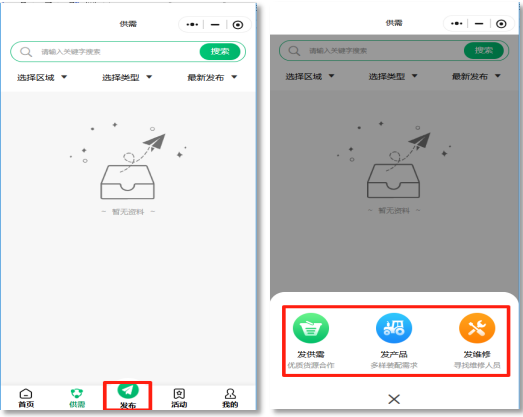 选择小程序“发布”模块,出现弹窗,可进行信息分布,发布类型包含发供需、发产品、发维修等,按需进行发布,发布信息平台审核通过后对外展示。