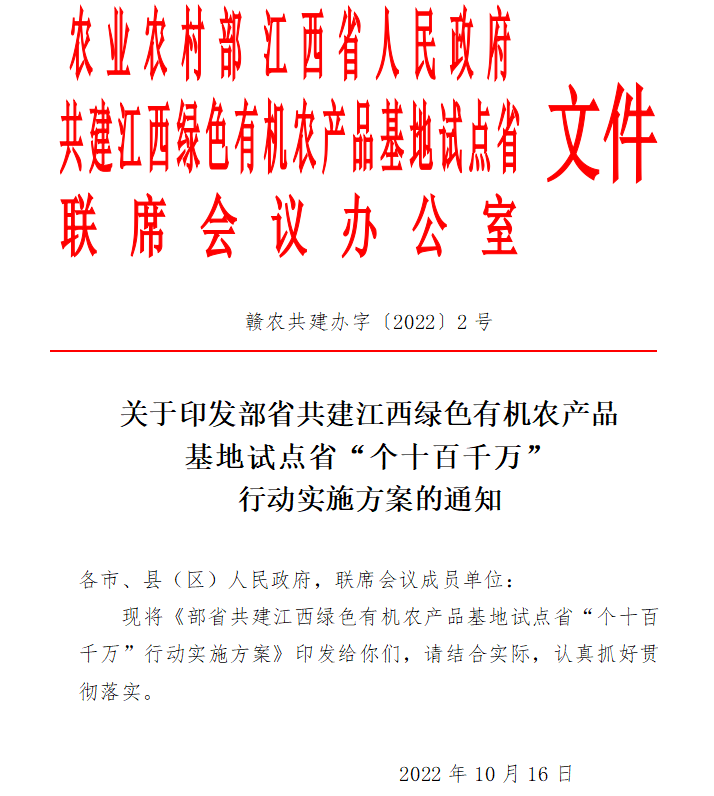 为贯彻落实《农业农村部 江西省人民政府共建江西绿色有机农产品基地试点省框架协议》精神,着力打造统筹推进农业生产和农产品两个“三品一标”、建立促进农业高质高效机制江西样板,根据《农业农村部办公厅关于印发〈农业生产“三品一标”提升行动实施方案〉的通知》(农办规〔2021〕1号)及《农业农村部关于实施农产品“三品一标”四大行动的通知》(农质发〔2022〕8号)有关要求,按照“三步走”路线图,在夯实部省共建“四梁八柱”的基础上,以“作示范、勇争先”的气概和作为,感恩奋进、接续奋斗,大力实施“七大工程”,重点推进“个十百千万”行动。现结合工作实际,制定本方案。
