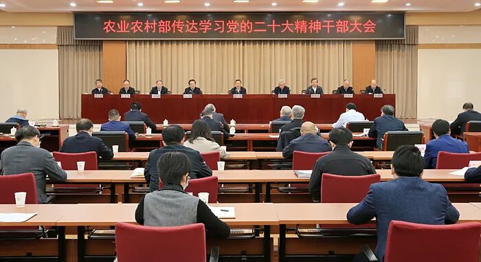 10月24日,中央农办主任、农业农村部党组书记、部长唐仁健主持召开部系统干部大会,传达学习党的二十大精神,部署安排学习宣传贯彻工作。会议强调,农业农村部党组和全体党员干部坚决拥护党的二十大作出的各项决策部署,坚决拥护以习近平同志为核心的新一届中央领导集体,自觉在思想上、政治上、行动上同以习近平同志为核心的党中央保持高度一致。部系统全体党员干部要迅速把思想和行动统一到党的二十大精神上来,深刻领悟“两个确立”的决定性意义,增强“四个意识”、坚定“四个自信”、做到“两个维护”,踔厉奋发、勇毅前行,努力做好新时代新征程三农工作,为全面建设社会主义现代化国家、全面推进中华民族伟大复兴作出三农贡献。