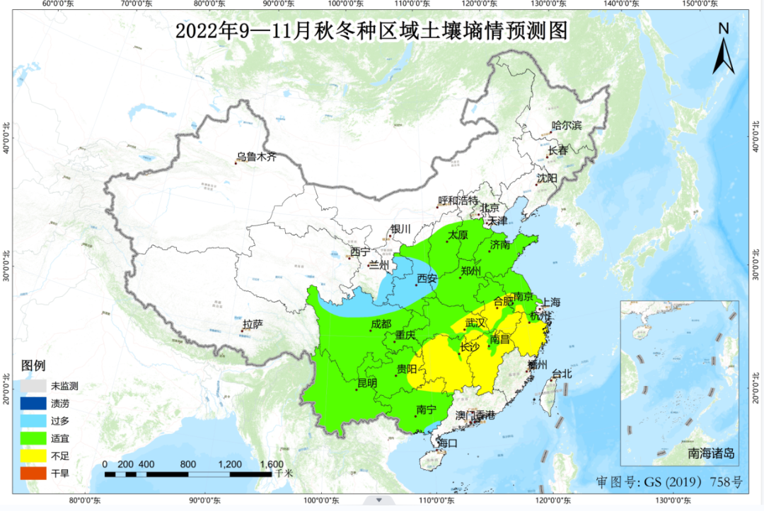 预计2022年秋季(9—11月),长江上游油菜区大部有多次降雨过程,雨量充沛,土壤墒情适宜至过多。长江中下游油菜区降水偏少,安徽南部、江苏南部、湖北南部、上海、贵州东部、湖南、江西、浙江等地降雨较常年偏少2—5成。该区域平原灌区前茬作物主要为水稻,灌浆期保有一定水层,因此油菜播栽时,大部分区域土壤墒情适宜;但该区域大部分旱地缺少灌溉条件,土壤墒情会持续下降,特别是缺水易旱的望天田、丘陵岗地及沿江部分山区。