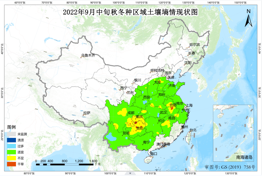 据全国土壤墒情系统监测,2022年9月12日,冬油菜区0—20cm土壤相对含水量47.4%—88.7%,大部墒情适宜,部分地区墒情不足。长江上游油菜区:9月以来,四川盆地大部出现中雨,攀西地区中到大雨、局部暴雨,前期旱情得到缓解。四川、重庆大部和陕西南部部分地区0—20cm土壤相对含水量高于65%,墒情整体适宜;贵州北部、东部旱情持续发展,并进一步向西、向南蔓延。长江中游油菜区:9月以来,该区域以睛天多云为主,大部农区0—20cm土壤相对含水量处于40%—80%。湖北、湖南缺少有效降雨,望天田、丘陵岗地等墒情持续不足,旱象严重;湘南湘西局地有阵性降水和中到大雨,旱情有所缓解;安徽沿江及南部山区、丘岗等地墒情不足。长江下游油菜区:江苏、上海等地农区0—20cm土壤相对含水量大多高于75.0%,墒情适宜。