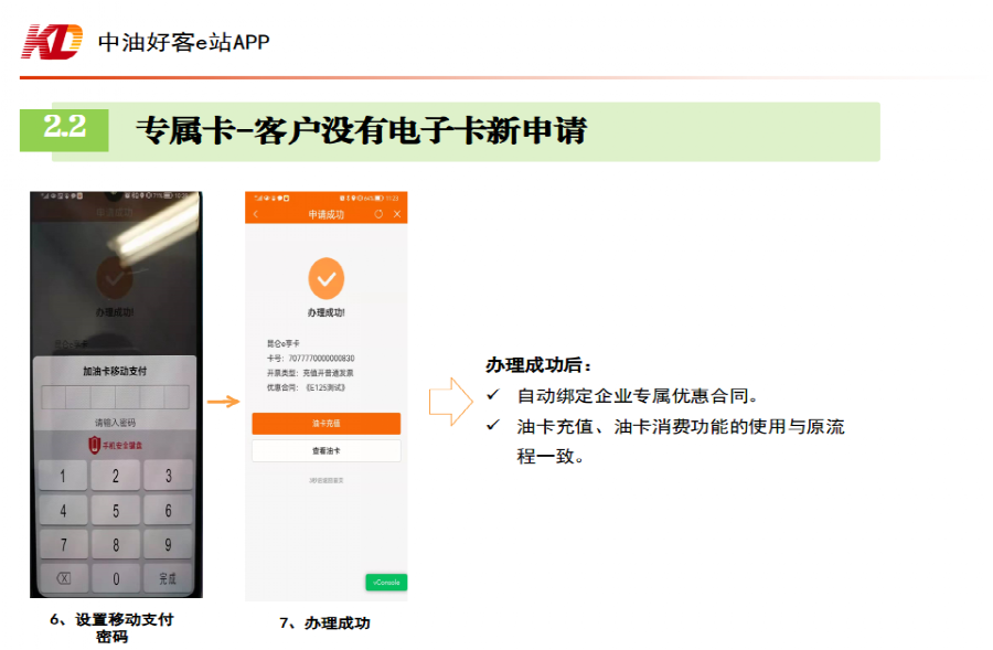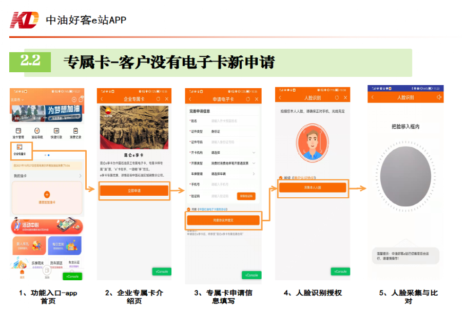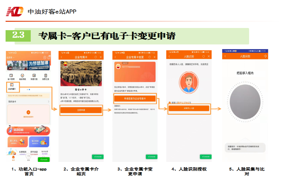“白名单”内个人农机用户及无需增值税专用发票的单位客户(普通发票单位客户可线上认证)使用收集的手机号登录中油好客e站APP-首页-功能快捷区第二行左滑-点击“企业专属卡”,根据指引进行电子卡的申领,进行人脸验证后完成申报认证。