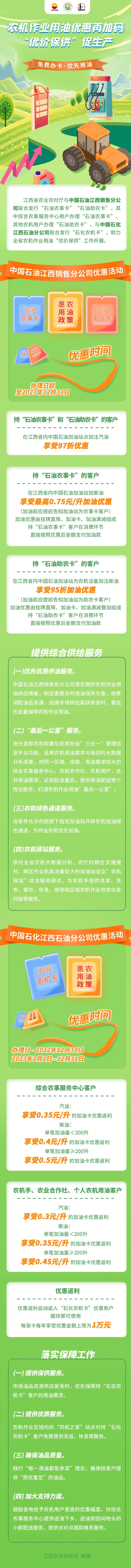 中国石油江西销售分公司、中国石化江西石油分公司相关销售分支机构向持有合法有效行驶证、驾驶证和跨区作业证的拖拉机、联合收割机机手,或者持有农业客户认证证明的农机手,免费办理农机加油卡;插秧机、抛秧机用户凭当地农业农村部门的认证证明免费办理农机加油卡。各级农业农村部门要主动服务,提供农机牌证信息和查询服务支持以及及时开具相关证明。中国石油江西销售分公司为江西省全程机械化综合农事服务中心客户发行“石油农事卡”,为其他农机作业用油客户发行“石油助农卡”。中国石化江西石油分公司为农机作业用油客户发行“石化农机卡”。