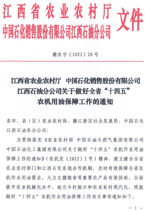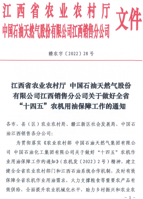近日,江西省农业农村厅与中国石油江西销售分公司、中国石化销售股份有限公司江西石油分公司分别签订保障全省“十四五”农机用油工作方案,方案惠及全省农机用户及农机手,确保在平稳抢收农作物基础上,保质保量为农机用户提供最优惠的用油政策。