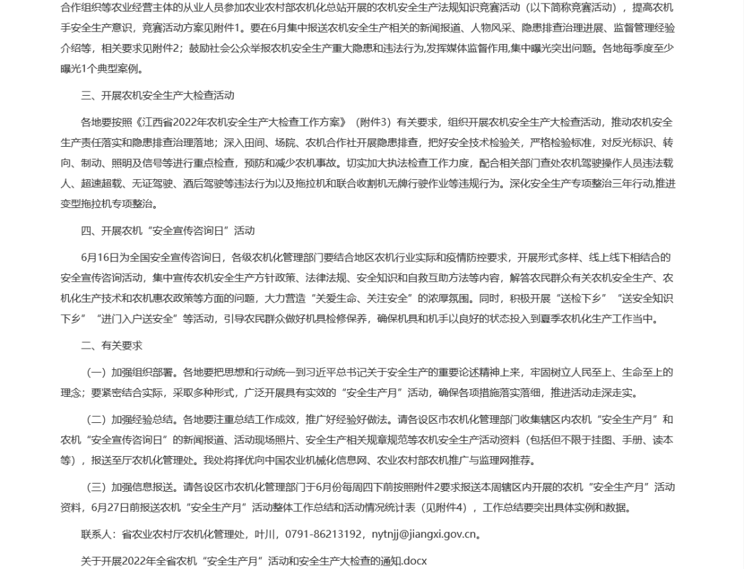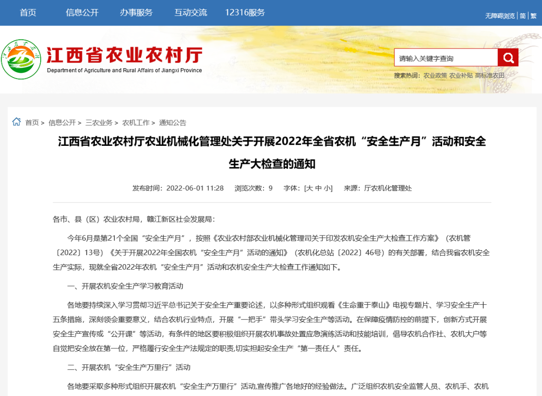 江西省农业农村厅农业机械化管理处关于开展2022年全省农机“安全生产月”活动和安全生产大检查的通知