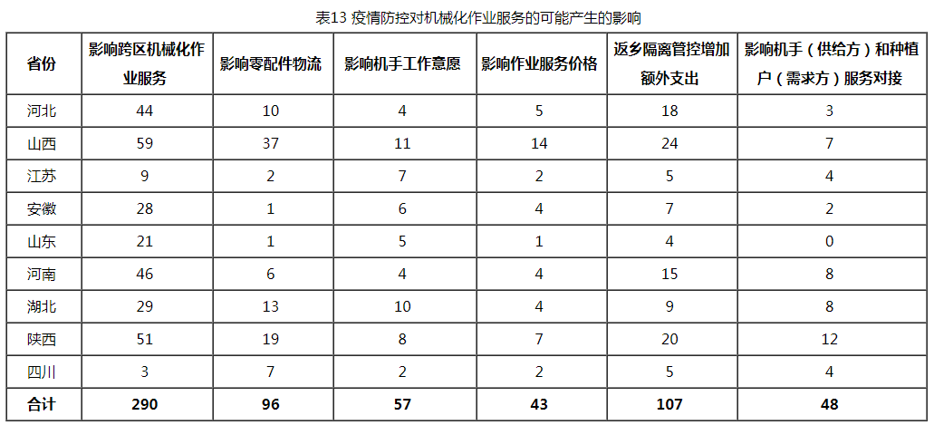 (一)疫情影响下“三夏”生产面临的主要问题。从表12、13可以看出,今年“三夏”生产面临的主要问题为燃油价格走高与新冠肺炎疫情防控,涉及样本数分别为324个和175个,合计占样本总数的77.85%。其中,疫情防控对机械化作业服务可能产生的影响主要为跨区机械化作业服务与返乡隔离管控,涉及样本数分别为290个和107个,合计占样本总数的61.93%。