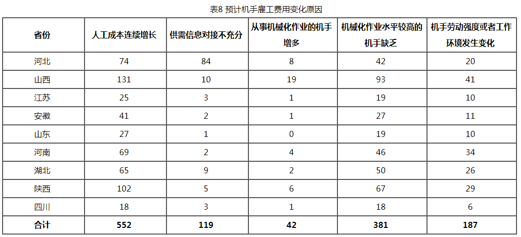 从表8可以看出,人工成本连续增长和缺乏作业水平较高的机手是导致机手雇工费用增长的主要因素,涉及样本数分别为552个和381个,分别占样本总数的86.12%与59.44%。