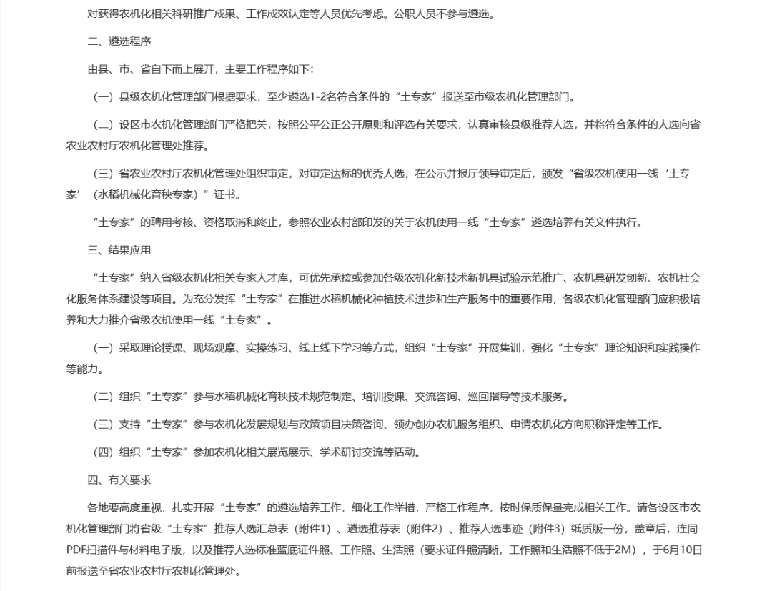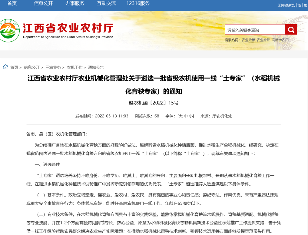 江西省农业农村厅农业机械化管理处关于遴选一批省级农机使用一线“土专家”(水稻机械化育秧专家)的通知