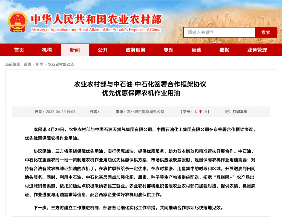 中石油、中石化在重要农时一地一策制定农机作业用油优先优惠保供方案,市场供应紧缺紧张时,足量保障农机作业用油需要;对持有合法有效农机牌证加油的农机手,在农忙季节给予一定优惠,在农时紧张、用量集中的时段和区域,开展送油到田间地头服务。
