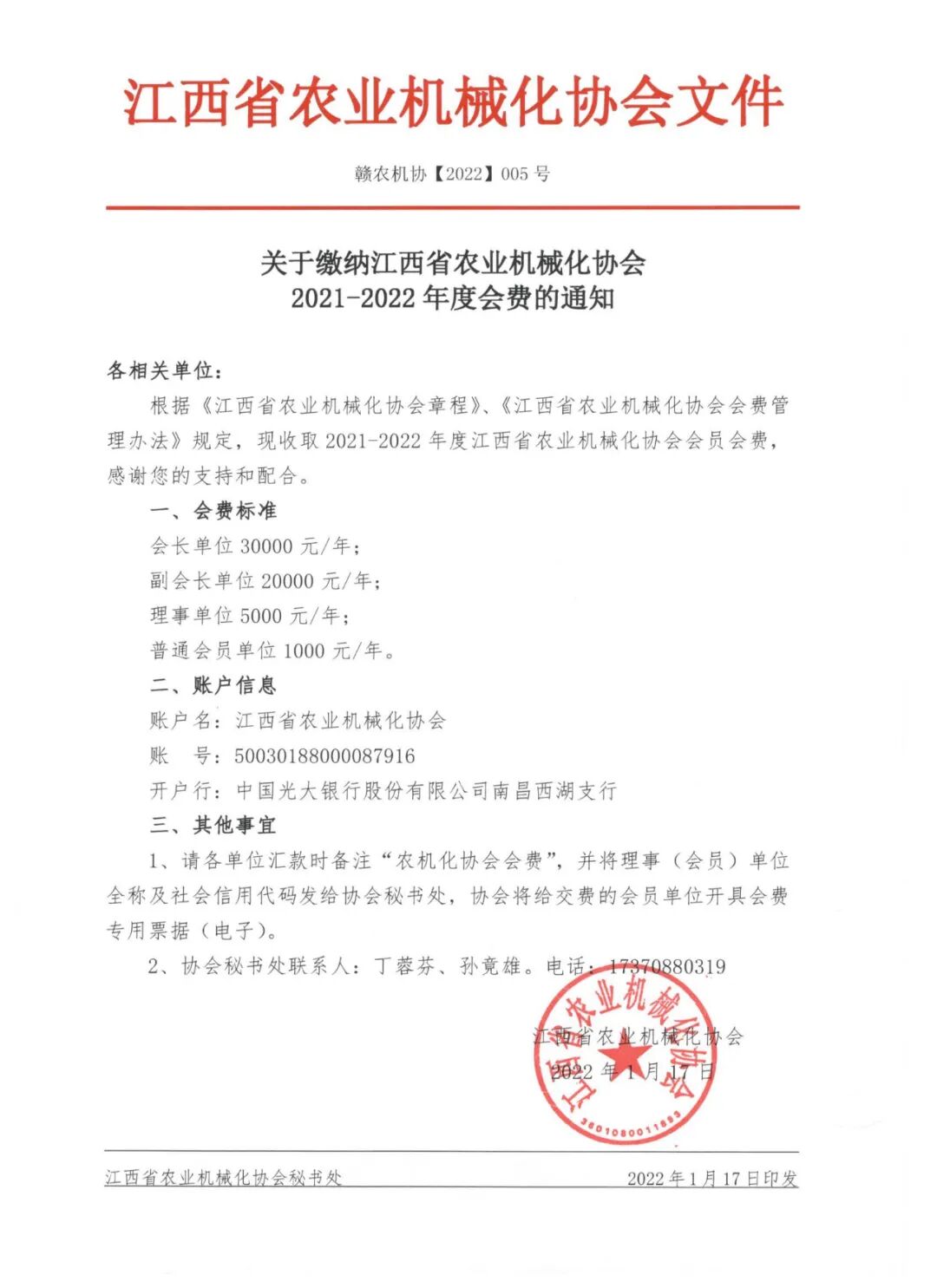 根据《江西省农业机械化协会章程》、《江西省农业机械化协会会费管理办法》规定,现收取2021-2022年度江西省农业机械化协会会员会费,感谢您的支持和配合。