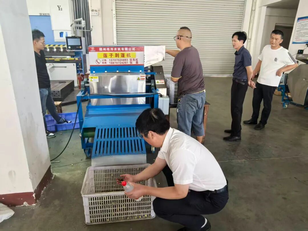 调研过程中,调研组一行深入赣州伟邦农机有限公司生产车间,实地观摩企业生产运营与产品研发情况。公司负责人张东红陪同讲解,详细介绍了企业近期在农机产品研发领域的突破成果、当前业务拓展态势,以及发展过程中面临的实际问题,为调研组全面了解企业现状提供了清晰参考。在产品展示环节,两款针对莲子产业的特色农机设备成为焦点。其中,新上市的鲜莲视觉分选机凭借先进的视觉识别技术,可精准完成莲子大小分级与残渣筛选,从根本上解决传统人工分选效率低的痛点,大幅提升莲子加工环节的生产效能。另一款核心设备莲子剥蓬机现场进行了性能测试,数据显示,莲子剥蓬机的小时生产率269.68kg/h,脱蓬率99.7%,损伤率为0,总损失0.76%,该设备每小时处理量可达 270公斤剥蓬作业,同时还能自动筛选出不合格的小颗粒莲子,实现 “高效剥蓬 + 品质筛选” 一体化,为莲子规模化种植加工提供了有力的设备支撑。