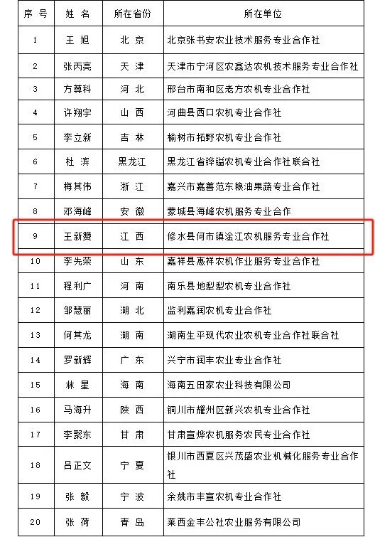 江西省农业机械化协会推荐人选获评“全国20佳农机合作社理事长”