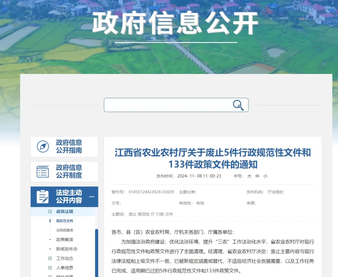 为全面贯彻落实党的二十大和二十届三中全会精神,认真践行习近平法治思想,持续深入推进全省农业农村法治建设,加强依法行政,提升“三农”工作法治化水平,省农业农村厅对现行有效的行政规范性文件和政策文件进行了全面清理。