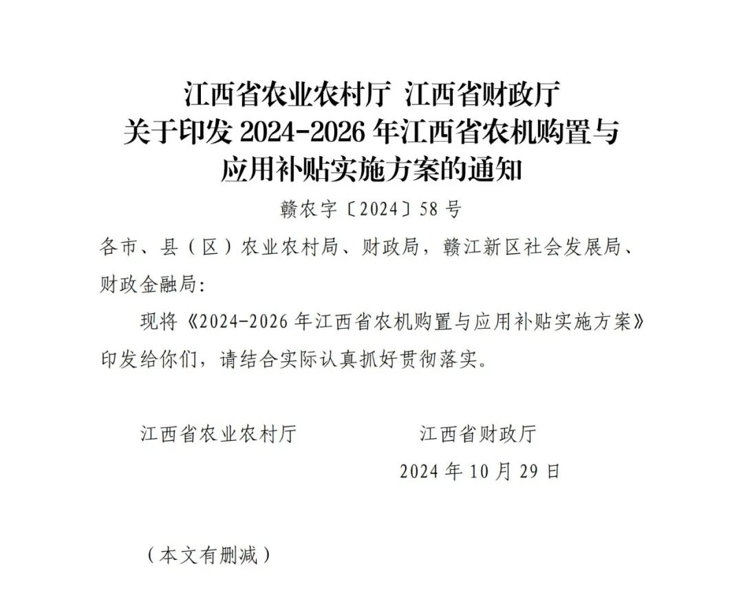 江西省农业农村厅 江西省财政厅印发2024-2026年江西省农机购置与应用补贴实施方案