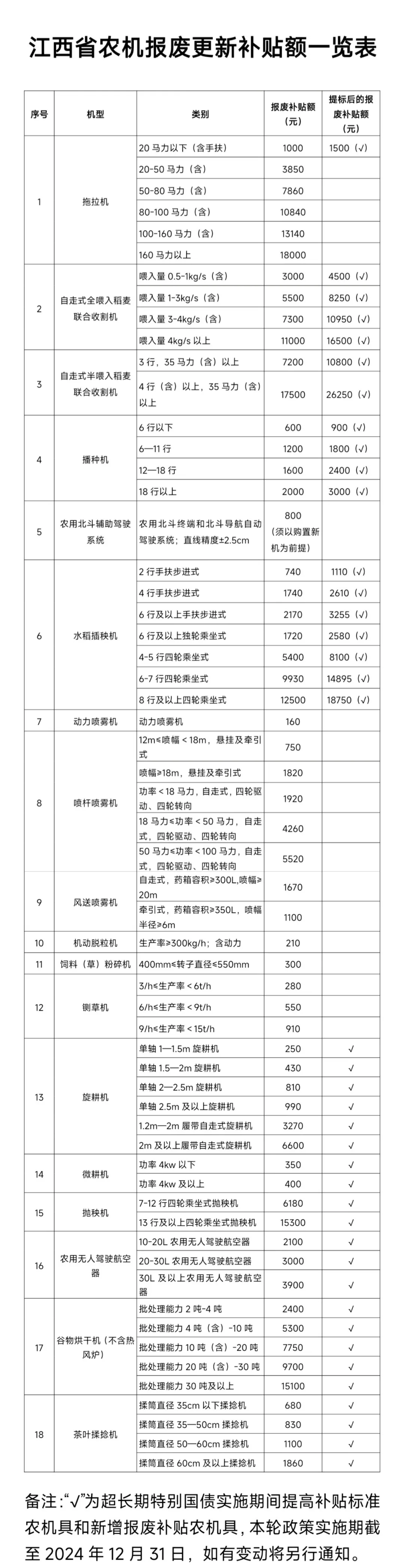 在超长期特别国债支持农机报废政策实施期间内,对申请报废联合收割机、水稻插秧机、播种机并新购置同种类机具,按50%提高补贴标准;对报废20马力以下拖拉机,报废补贴额由1000元提高到1500元。详见《江西省农机报废更新补贴额一览表》。